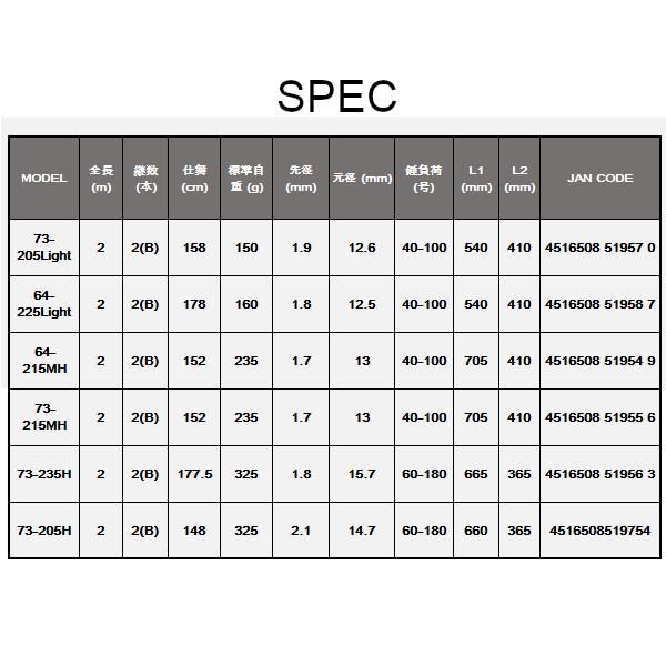 40号錘などライトタックルでの使用を想定し、一日手持ちでも疲れない細身・軽量、喰い込みの良さと前アタリをしっかり感知する感度を両立したしなやかな穂先、船べりでの突っ込みに対応するバットと、ライト落とし込みに必要な要素を凝縮。7:3の鋭敏な先調子で、わずかな変化をしっかり捉えテクニカルに攻める。