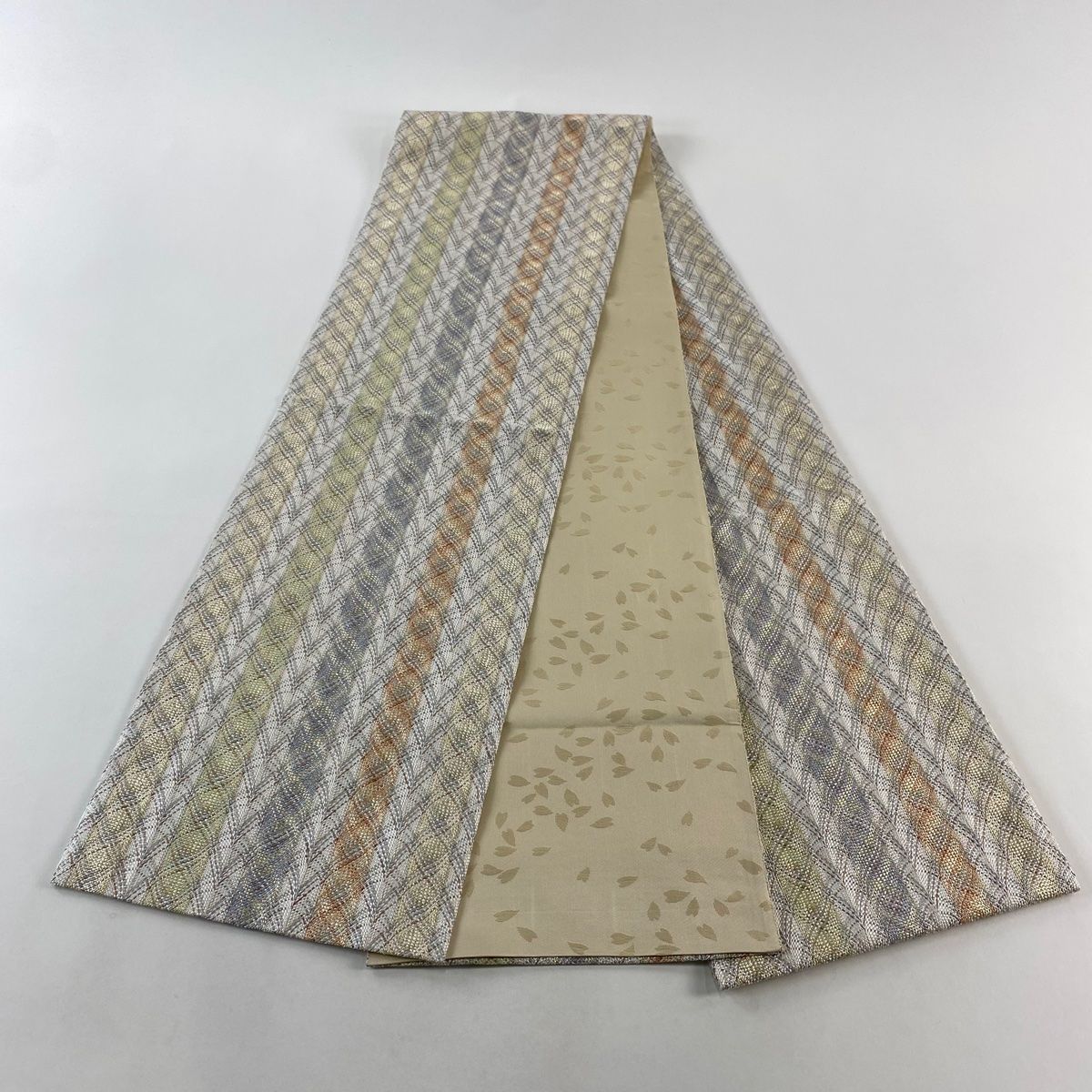袋帯 秀品 縞 幾何学 金糸 灰白 全通 正絹