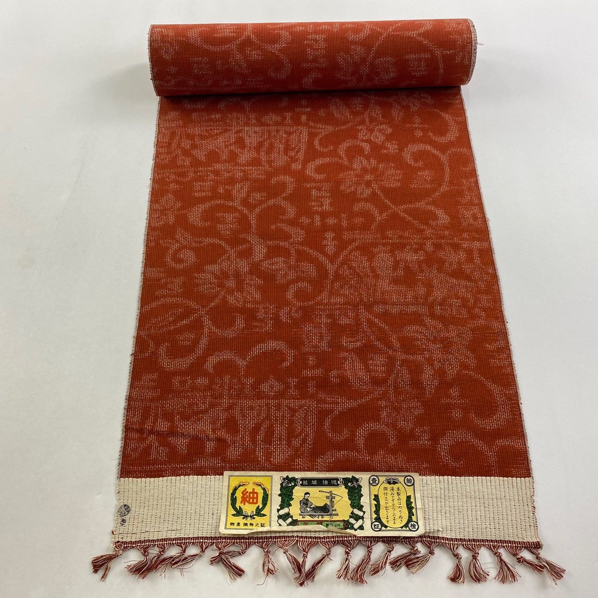 反物 秀品 紬 証紙あり 花唐草 赤茶 正絹