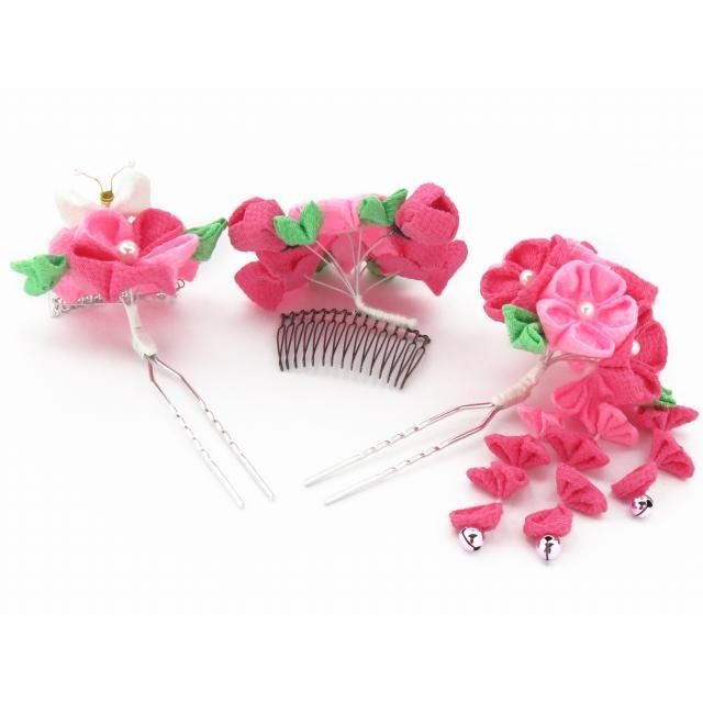 ちりめんつまみの小花に蝶や下がり、銀ビラが付いたかわいらしい髪飾り3点セットです。