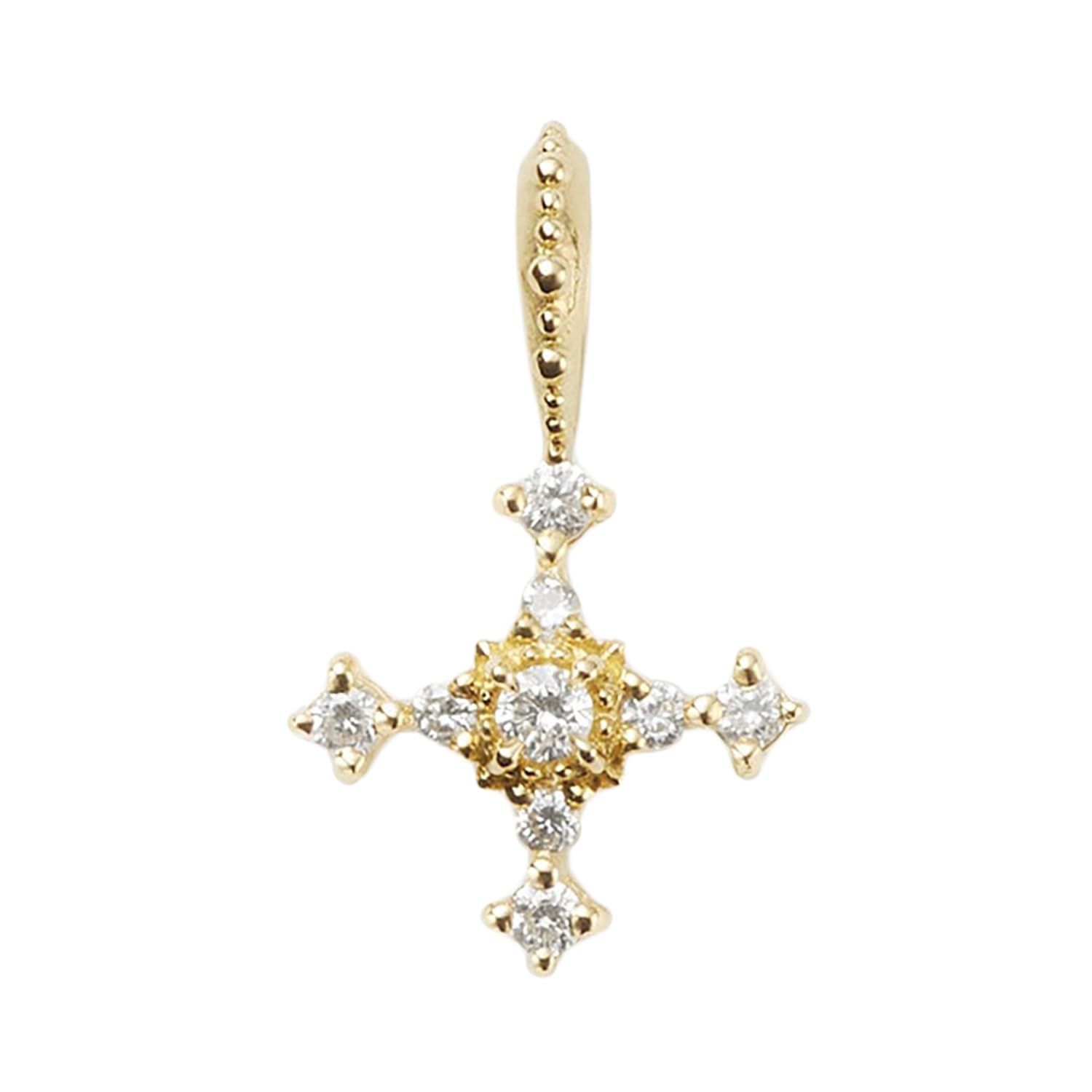 ダイヤモンドの輝きを生かしたクロスチャームです。小振りでありながらも、石座に立体的な高さを出す事で存在感を演出。小さな正十字のシルエットが、胸元に光を感じさせてくれるような凛とした印象を演出してくれます。K18、ダイヤにこだわりつつも愛らしいプチサイズに仕上げました。