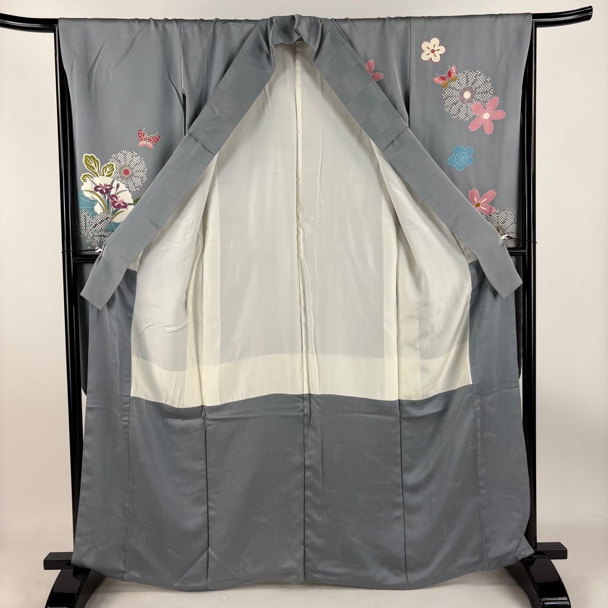 振袖 身丈162.5 cm 裄丈65 M 袷 千地泰弘 落款 菊 蝶 ぼかし 青灰色 正絹