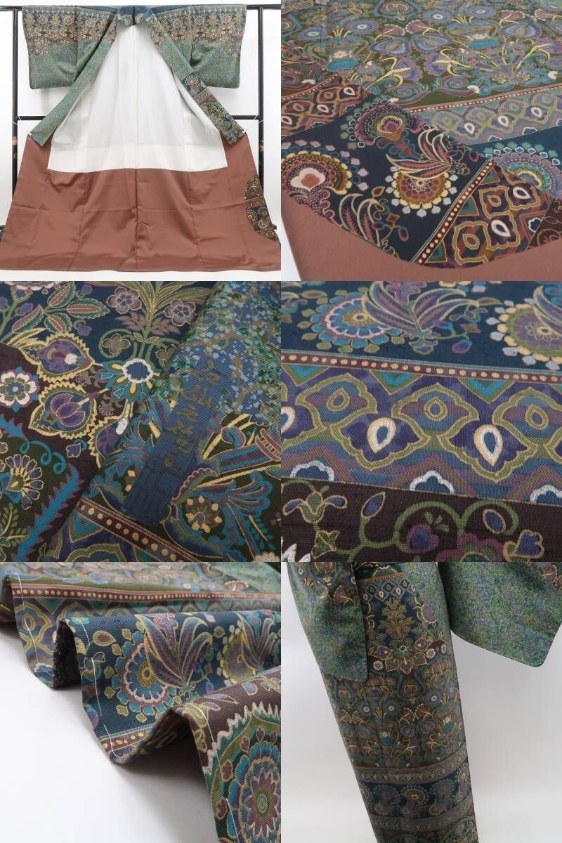 こちらのお着物は、高麗納戸色×多彩な色で更紗文様を込めた一枚。巧みな構図で柄に変化を持たせており、落ち着きのある色調にダイナミックなデザインが魅力的です。