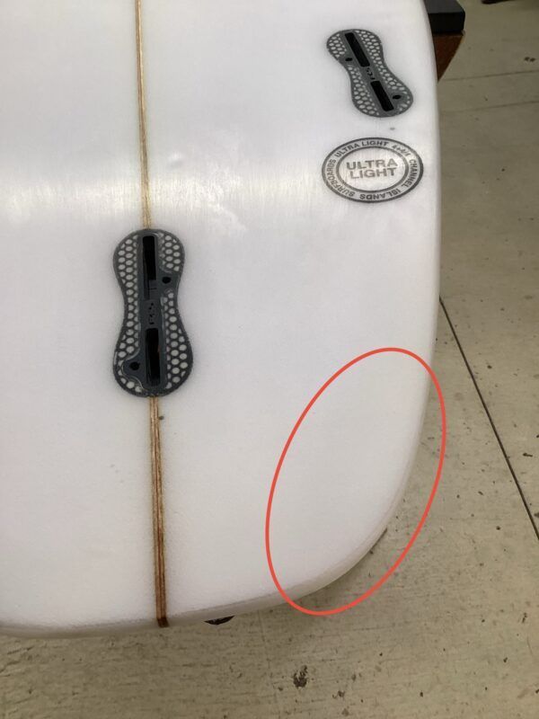 前足あたりのシングルコンケーブがアクセルとなり、フィンの間のダブルコンケーブが小波でもレールからレールへの切り返しを楽にしてくれる。J3