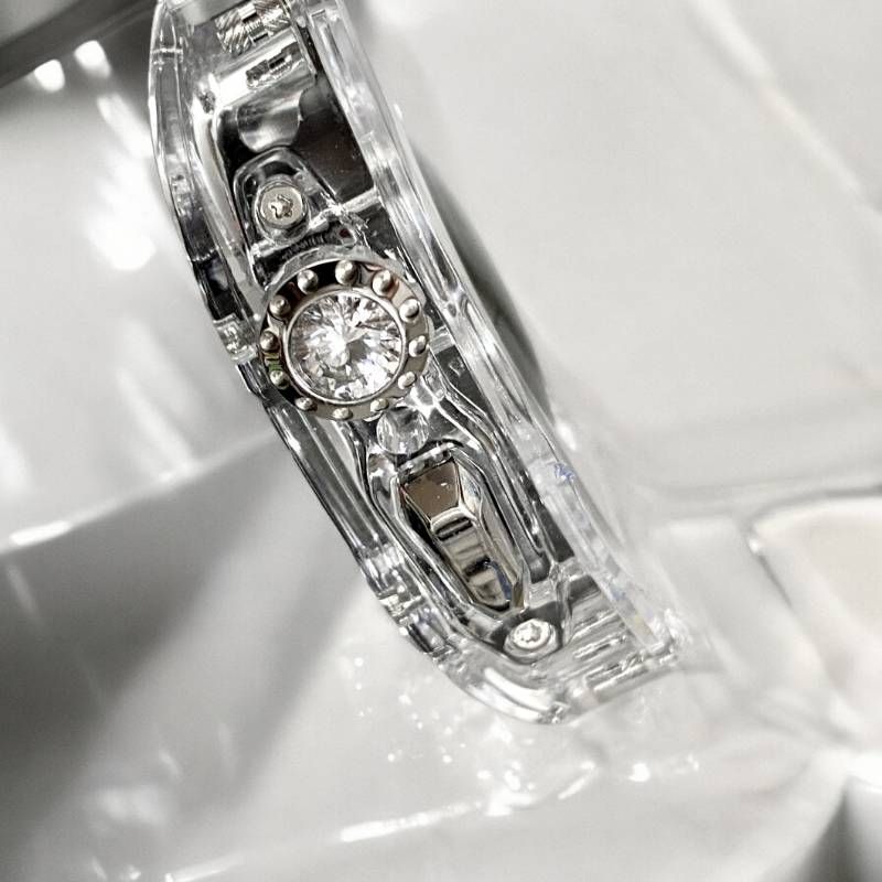 リューズ部分には、大粒のジルコニアを精密にセッティング。