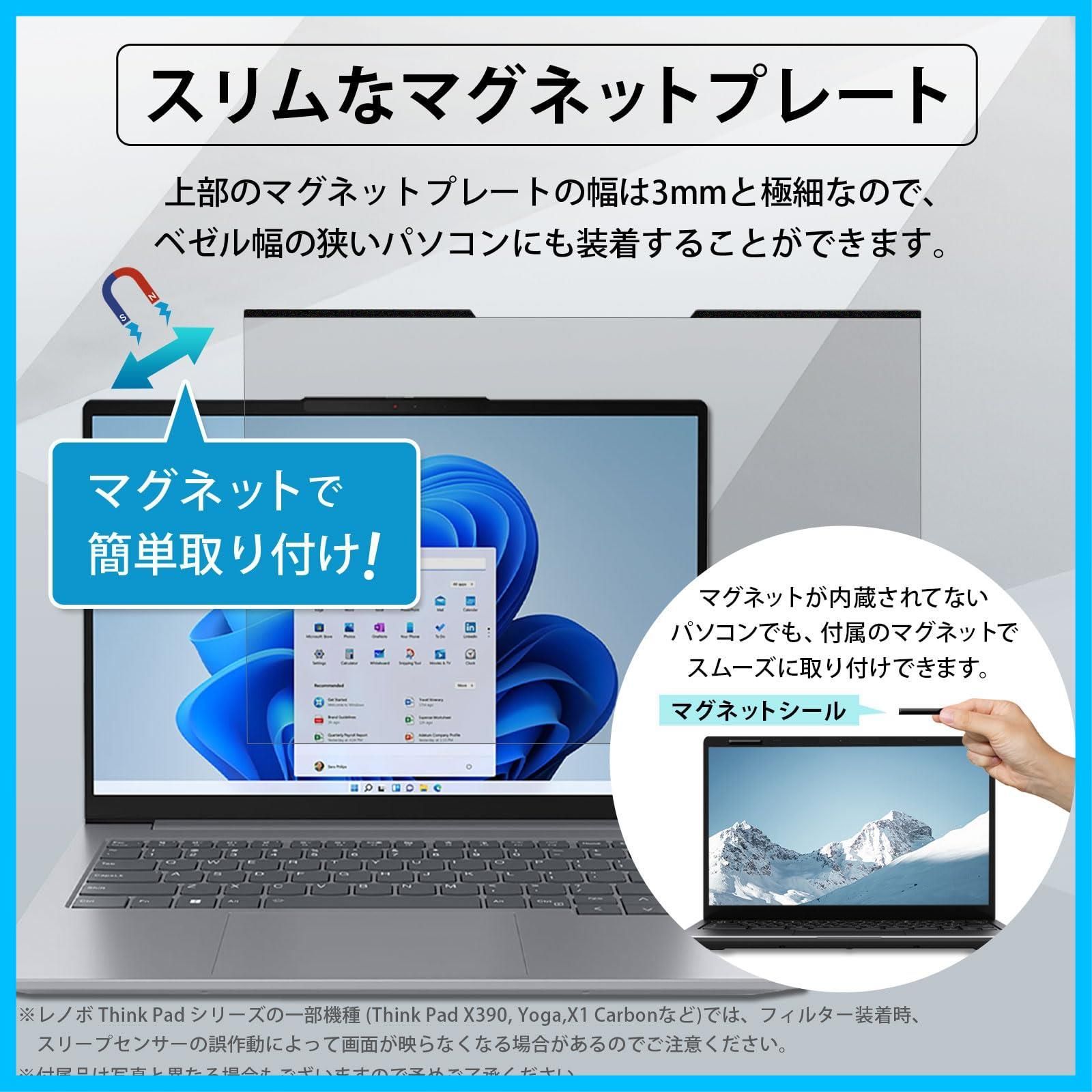 【覗き見防止】スクリーンの正面を中心に約60度(左右各30度)より外の角度からは画面が真っ暗に見えるので、横からの覗き見を防ぎ、プライバシーを守ることができます。 【マグネット式だから着弾簡単】マグネット式の覗き見防止フィルターなので、必要に応じて取り外しをすることが可能です。 【付属品も充実】マグネットが内蔵されていないパソコンでも付属のマグネットを使えば、装着することができます。(マグネットは4枚付いており、通常は2枚使えば大丈夫ですが、必要な場合は4枚お使いください。また、固定用のタブや両面テープも付属していますが、こちらも必要な時のみお使いください)※フィルターを装着したままPCのカバーを閉じると僅かに隙間が生じる機種もございますが、スリープ機能は問題なく作動します。