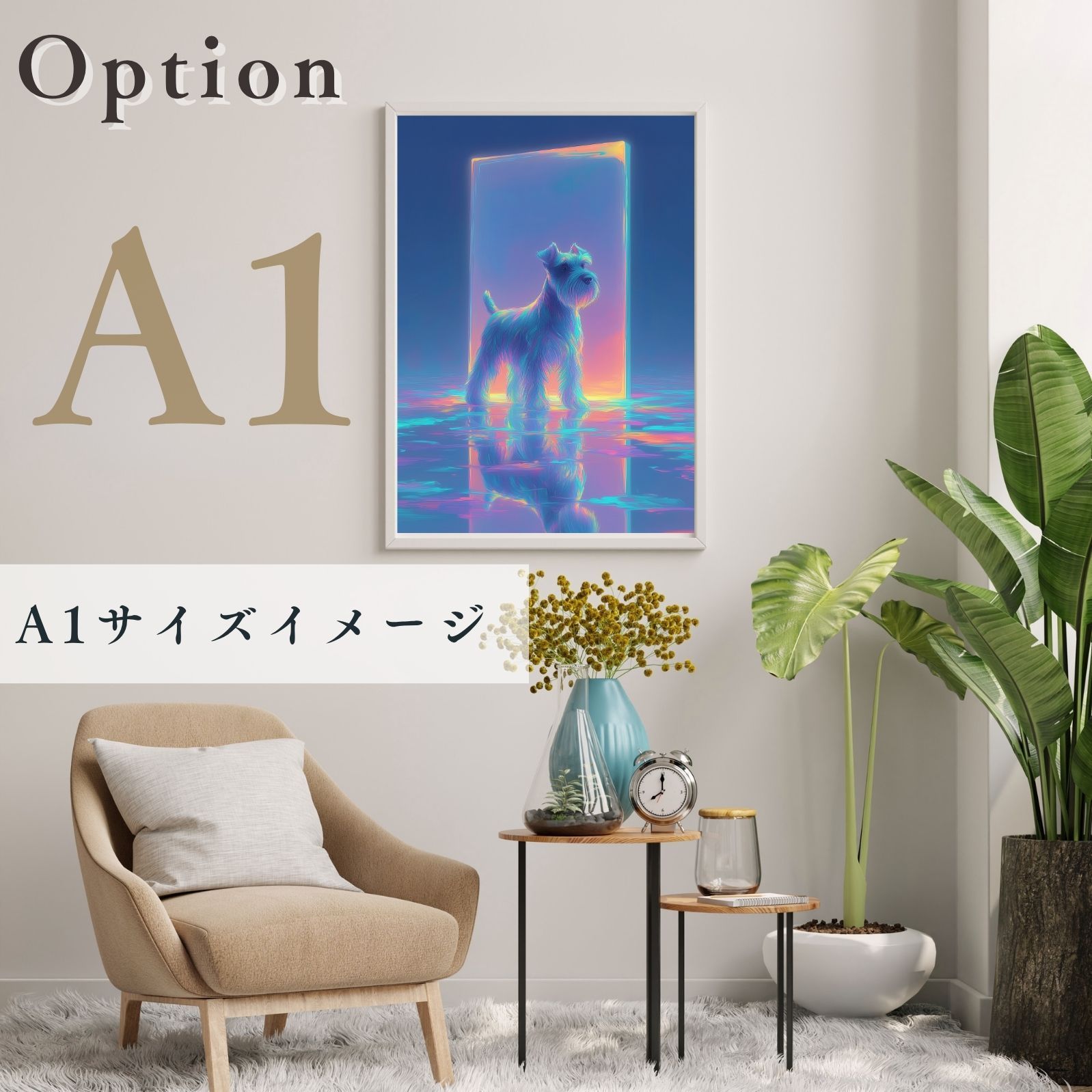 シュナウザー犬がオーロラのような光に包まれて、幻想的な色彩が空間にやさしく溶け込み、見るたびに癒しを与えてくれるアートポスター作品です。