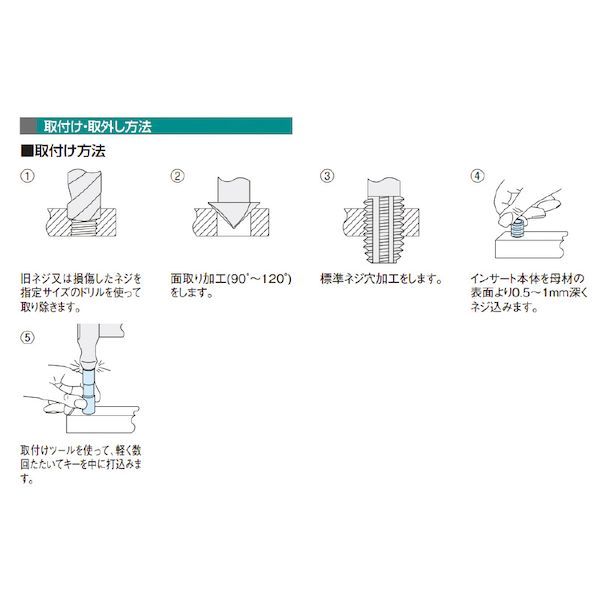 ●信頼性の高いネジの補強材●キーの打ち込みで容易にゆるみ止めができます。●損傷したネジを短時間で補修することができます。●ボルト脱着の頻度の高い箇所での使用に適しています。●鉄、非鉄金属、金属以外の材料等あらゆる母材のネジを強化することができます。●重荷重用●本体材質:SUS303●キー材質:SUS302
