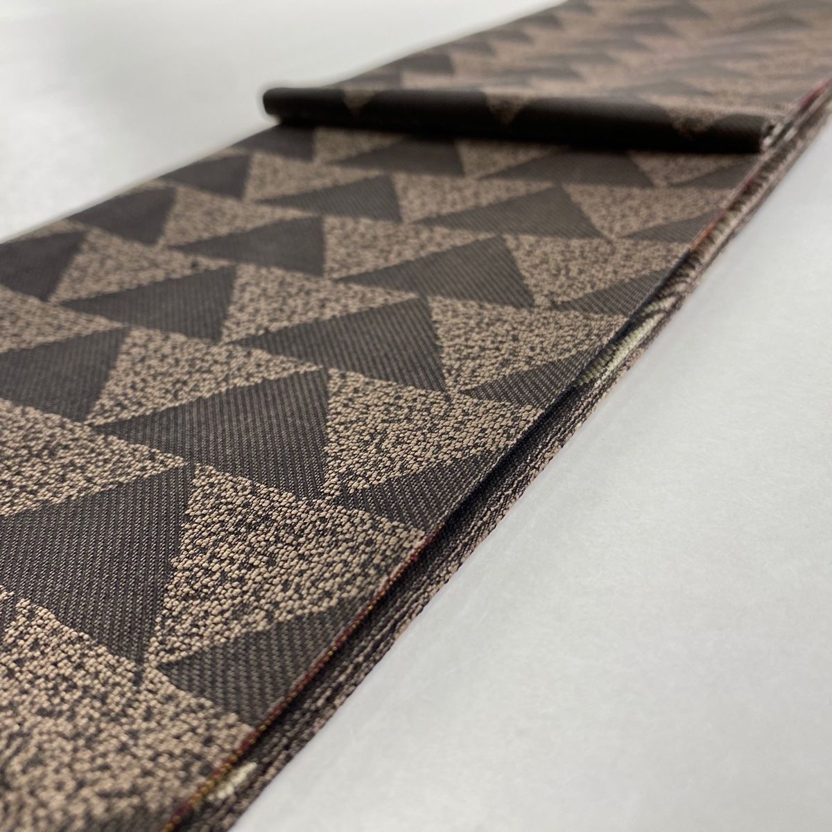 半幅帯 秀品 葉柄 縞 切り嵌め 焦茶色 正絹
