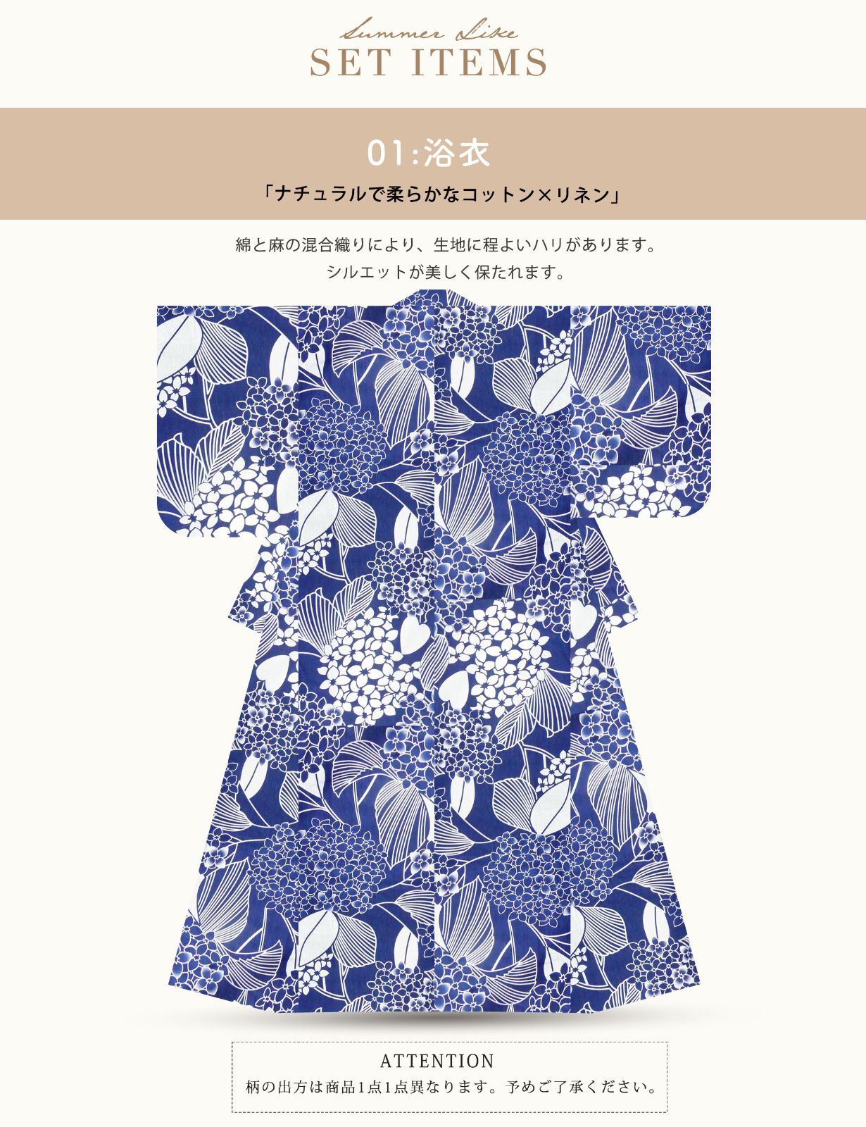 自然な風合いが魅力の綿麻素材を使用した、夏にぴったりの浴衣セットです。