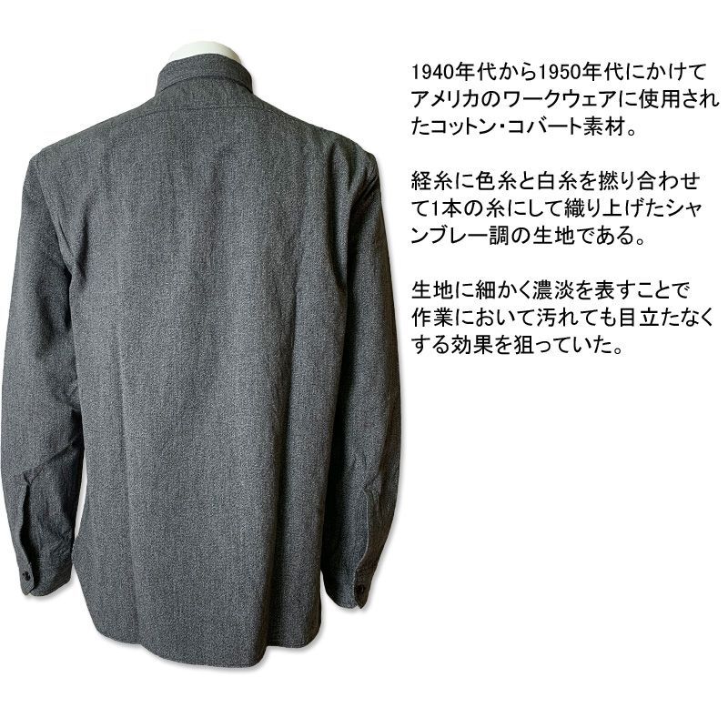 1940年代から1950年代にかけてアメリカのワークウェアに使用されたコットン・コバート素材。経糸に色糸と白糸を撚り合わせて1本の糸にして織り上げたシャンブレー調の生地である。生地に細かく濃淡を表すことで作業において汚れても目立たなくする効果を狙っていた。