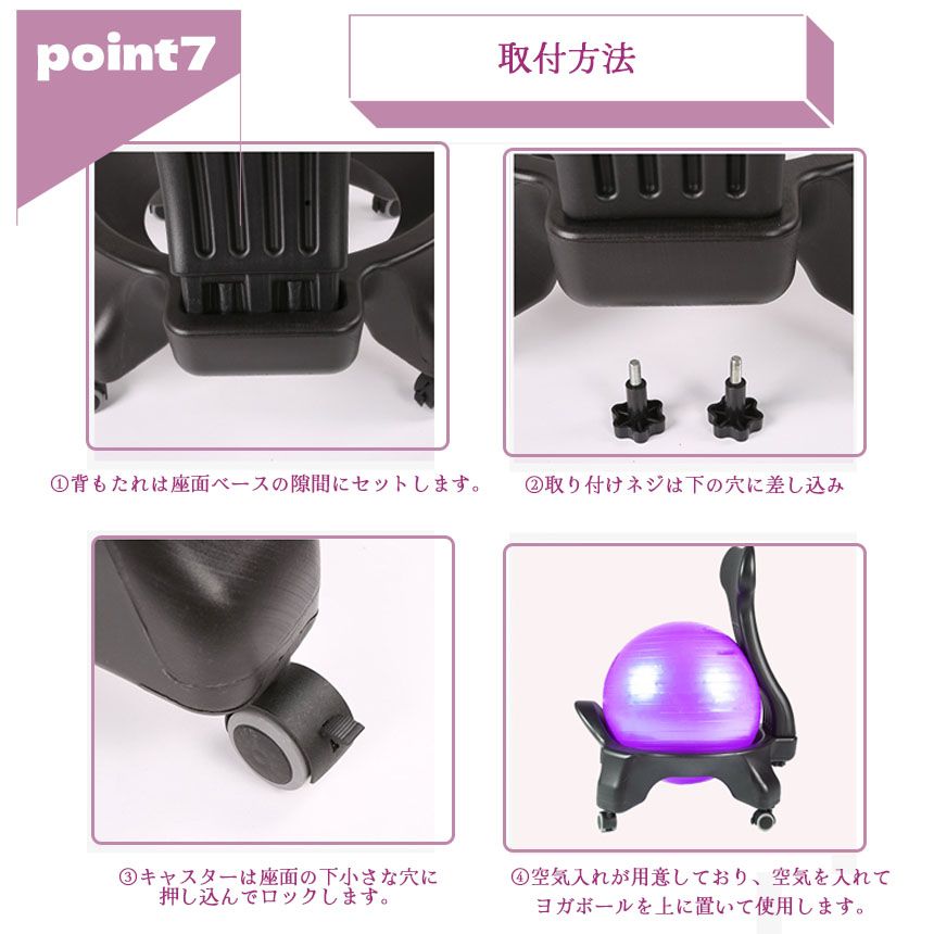 【組み立て簡単】取り付けは非常に簡単です。椅子のベースを組み立ててキャスターを取り付け、付属の空気入れポンプでボールを膨らませて椅子に固定するだけです。一度空気を満杯に入れていただいて後に、もう一度空気を抜いていただき、再度膨らませる必要がある場合もございます。