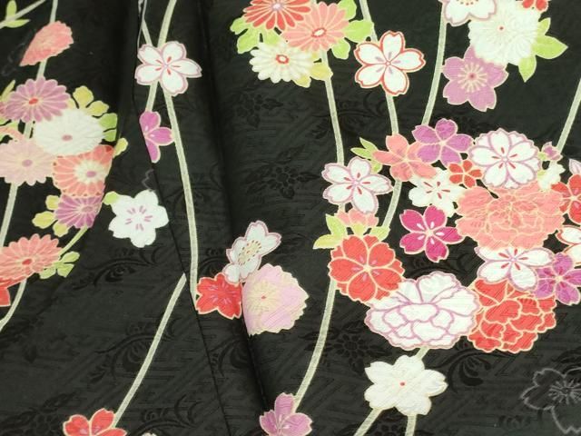平和屋着物 小振袖 二尺袖 草花文 黒地 洗える着物 op