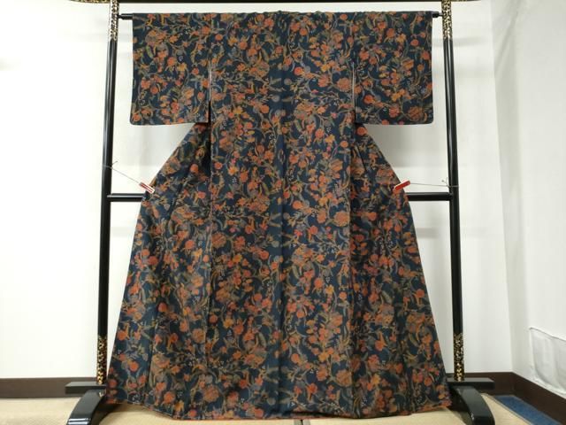 平和屋着物 上質な小紋 紬地 型染め 更紗花唐草文 正絹 yc