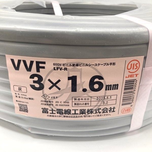 富士電線 VVFケーブル 3×1.6mm 灰色 100m 黒白赤