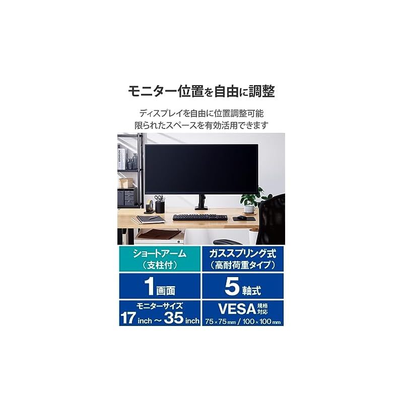 商品名:エレコム モニターアーム ブラケット式で取り付けしやすい 支柱式 17インチ~35インチ対応 耐荷重:15kg ガス式 VESA規格対応 ブラック DPA-SS10BK