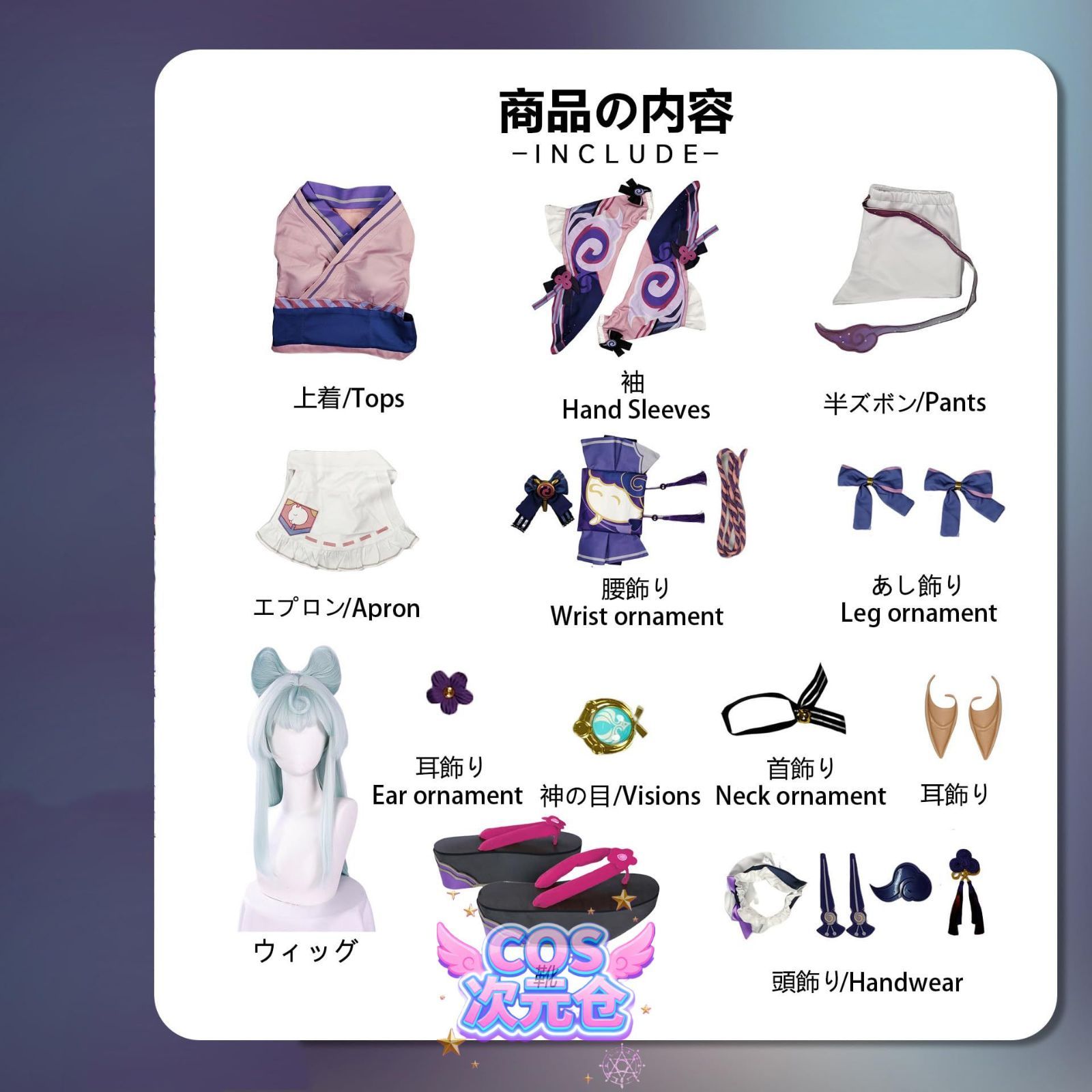 当店のコスプレ衣装につきましては、一部の商品リンクにはウィッグや靴が含まれている場合がありますが、一部の商品リンクの価格にはウィッグ、靴、または武器が含まれていない場合もございます。