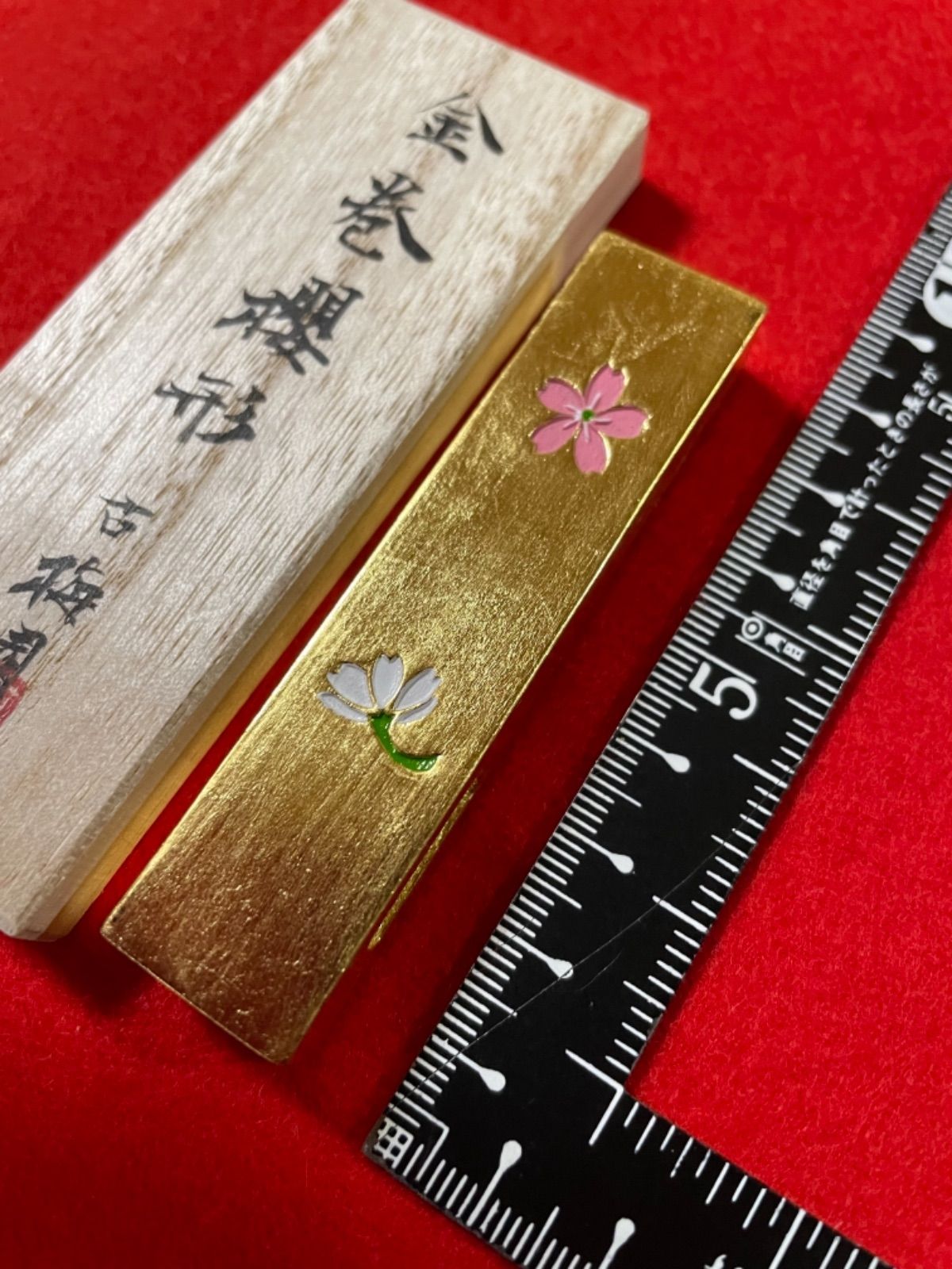 ピンク色と白色の桜模様があるかわいい金巻き墨です。女流の書道家に人気の逸品です。別注品となります。