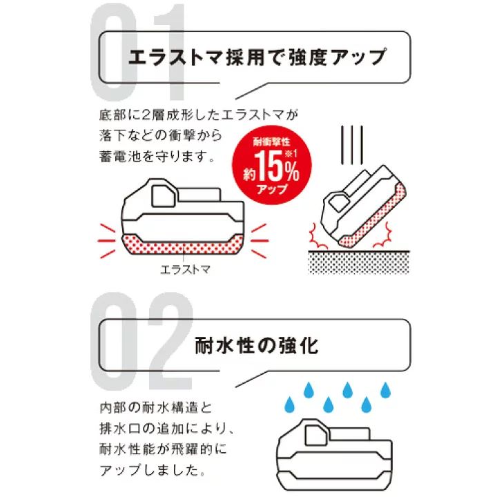 36Vも18Vも、どちらも使えるマルチボルトの特長はそのままに、底面に2層成形エラストマ採用で、落下時の耐衝撃性能がアップ。