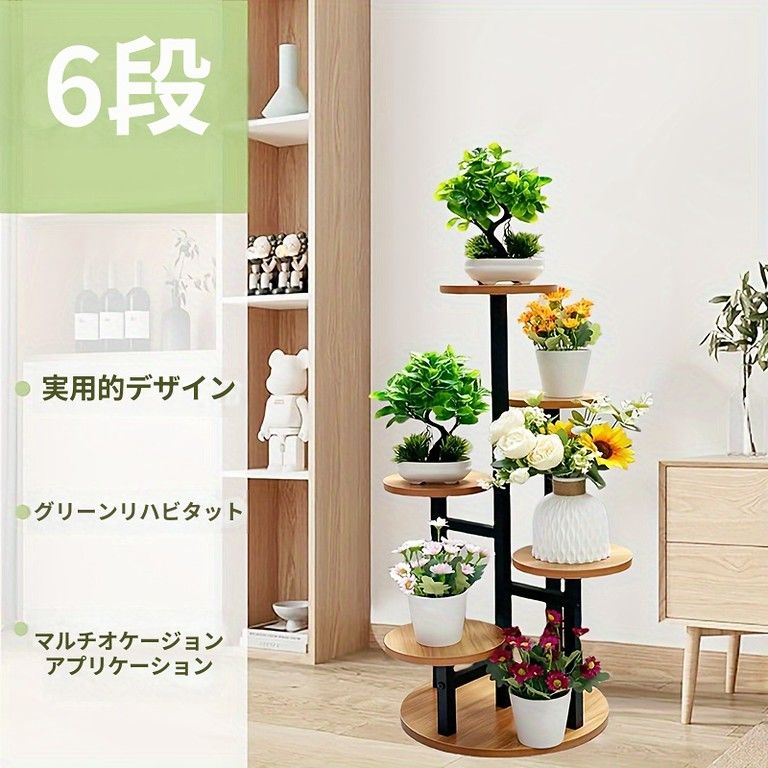 * **省スペースで多層ディスプレイ**: 6段のラウンドシェルフにより、限られたスペースでもたくさんの植物を効率的に飾ることができます。