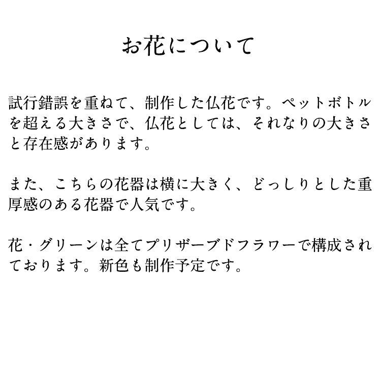 試行錯誤を重ねて制作したプリザーブドフラワーアレンジの仏花です。仏花としては、それなりの大きさがあり、500mLのペットボトルよりも少し大きいぐらいですので、仏壇などに飾られる場合は、サイズ確認をお願いします。