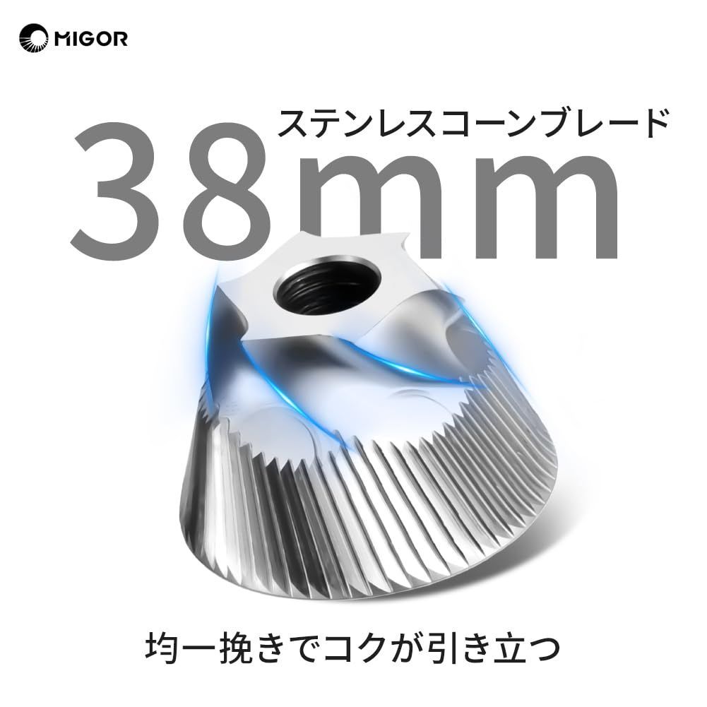 【38mm ステンレス製コニカルバー|風味を最大限に引き出す】- 自社開発・生産の38mmステンレス製コニカルバーを採用。セラミック製よりも耐久性が高く、研磨時の負荷を軽減。コーヒー豆の繊細な風味をロックし、香り豊かな一杯を提供します。