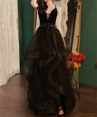 [CHUMO] ドレス イブニングドレス パーティードレス ロングドレス レディース 袖なし チュール Aライン ロング丈 演奏会 発表会 披露宴 お呼ばれ 結婚式 二次会 フォーマル エレガント (ブラック,S,S)