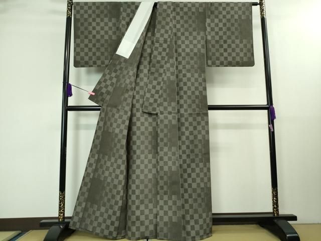 平和屋着物 上 本塩沢 単衣 変わり市松 海松茶色地 kh 5