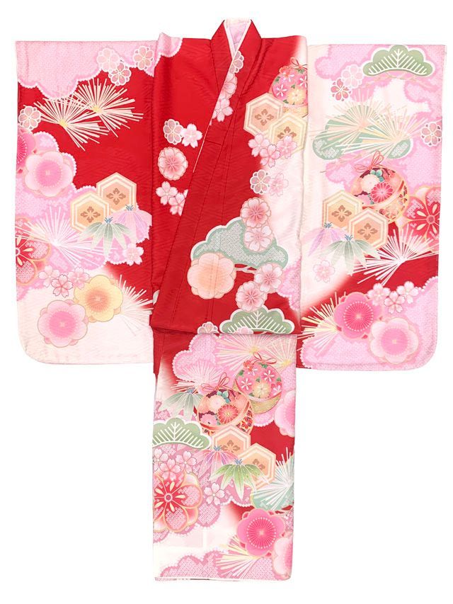 七五三 着物 7歳 女の子 式部浪漫ブランド 絵羽柄の着物 四つ身 子供振袖 合繊 赤 鞠梅 SR 7 pea 2504 tan