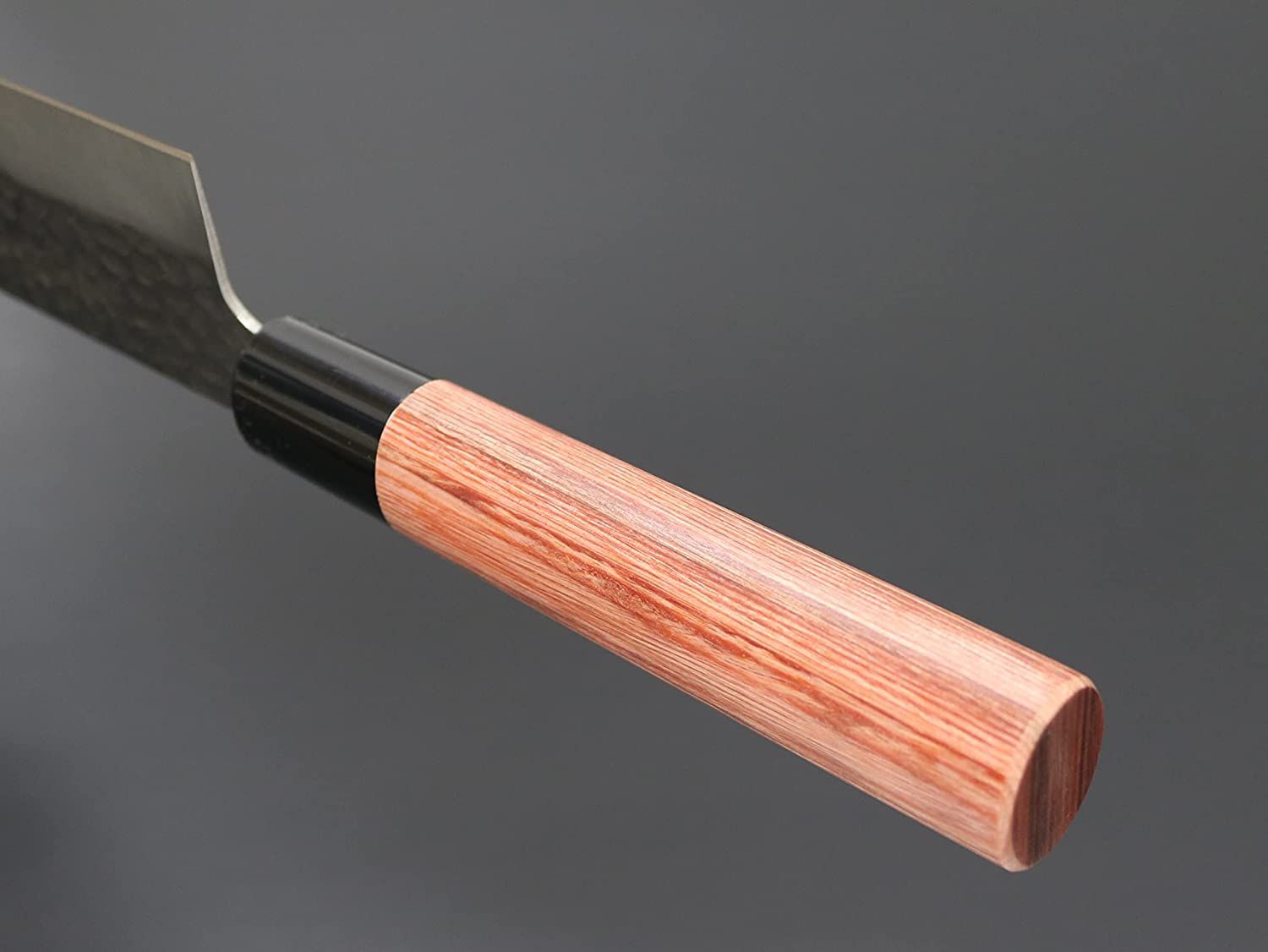 和包丁風のハンドルスタイル。ハンドル材は美しい木目調の赤合板材を使用。鋭い切れ味とメンテナンスの良さを兼ね備えた包丁。鎚目磨きは風合いが美しいだけでなく、食材がブレード面にくっつきにくいこともあり、切れ味を助長し切離れよく快適にカットできます。