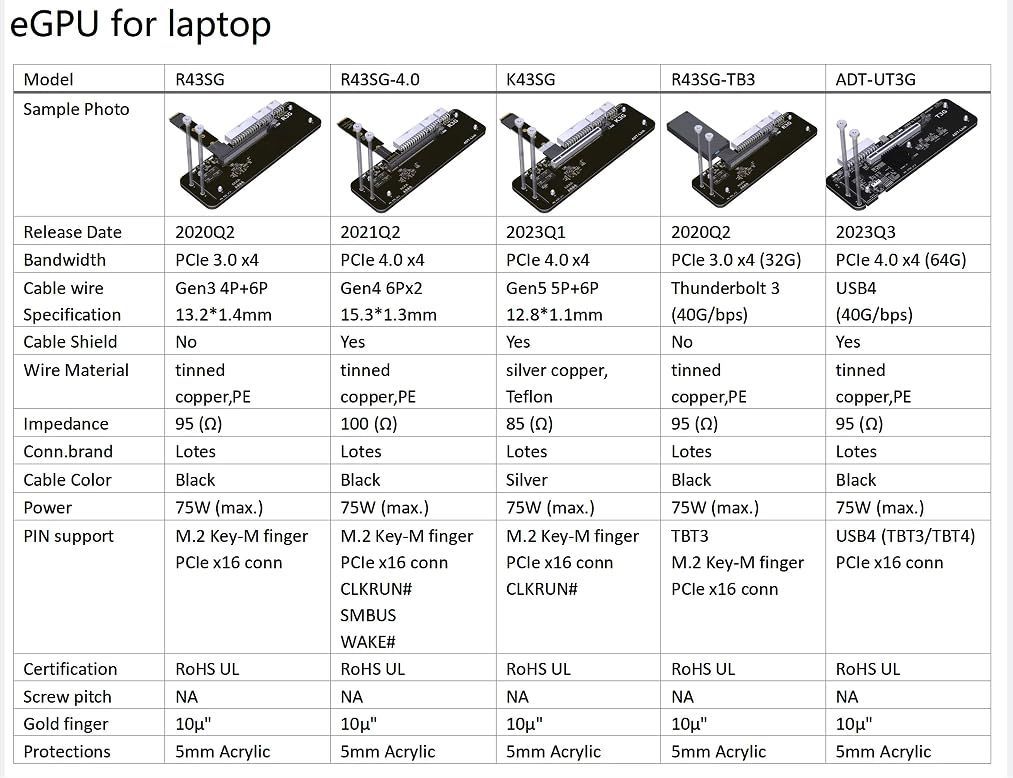 UT3Gアプリケーション:NUC / ITX / STX / Notebook PC対応のeGPU。 チップ:ASM2464PD 転送速度:Gen4 x2、40G/bps (最大 )。
