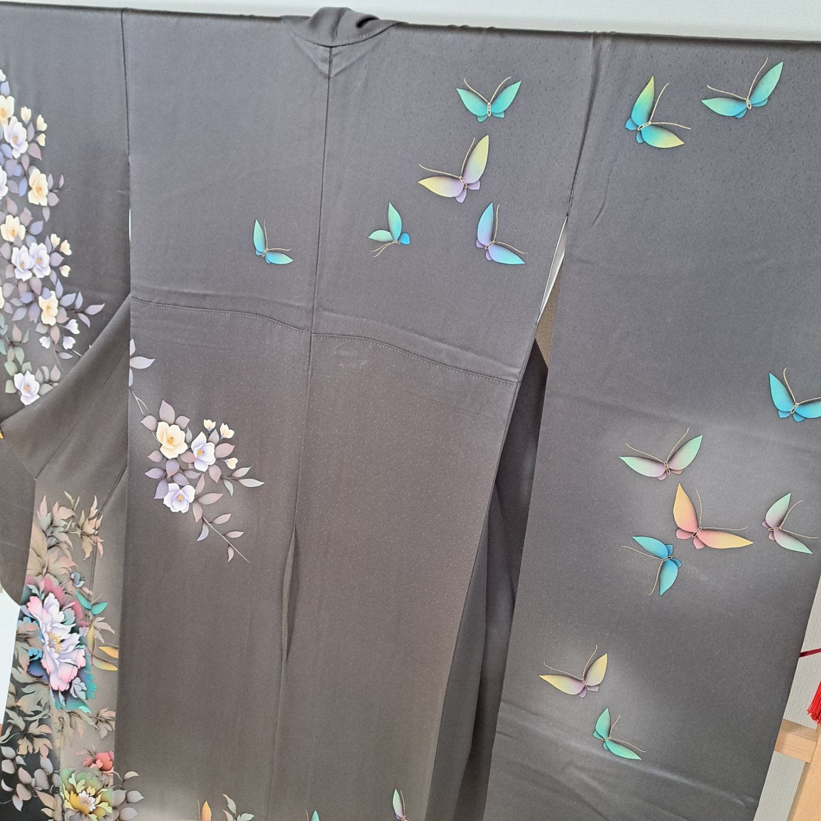 グレー地に蝶と牡丹や椿、水仙などの花がデザインされた、正絹の振袖です。