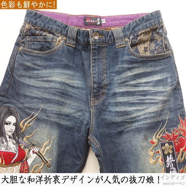 26%OFF ビッグ有 抜刀娘|バットウムスメ 葵刺繍 桜 炎 総刺繍DP 流水桜地切替 DENIM PANTS ストレッチ デニムパンツ 和柄アメカジ ジーンズ インディゴ 32|34|38|40 smtb-k ky