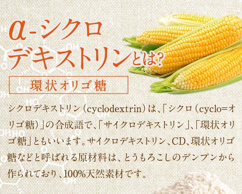 シクロデキストリンは、サイクロデキストリン、CD、環状オリゴ糖などと呼ばれる難消化性デキストリンの一種です。