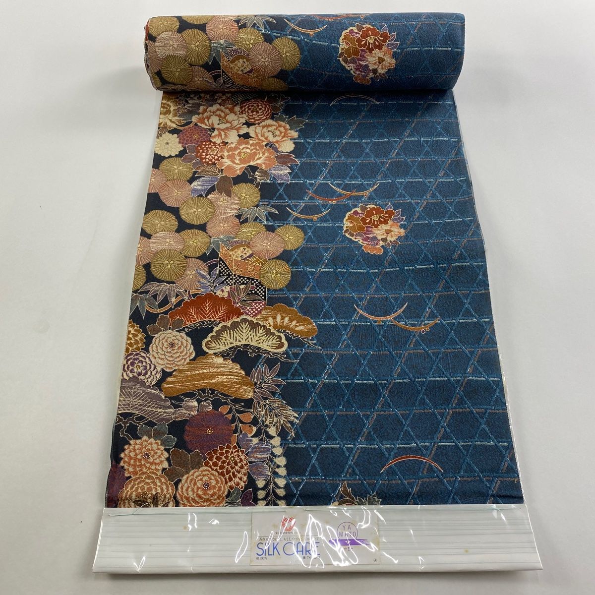 反物 秀品 小紋 松竹梅 籠目 金彩 青灰色 正絹