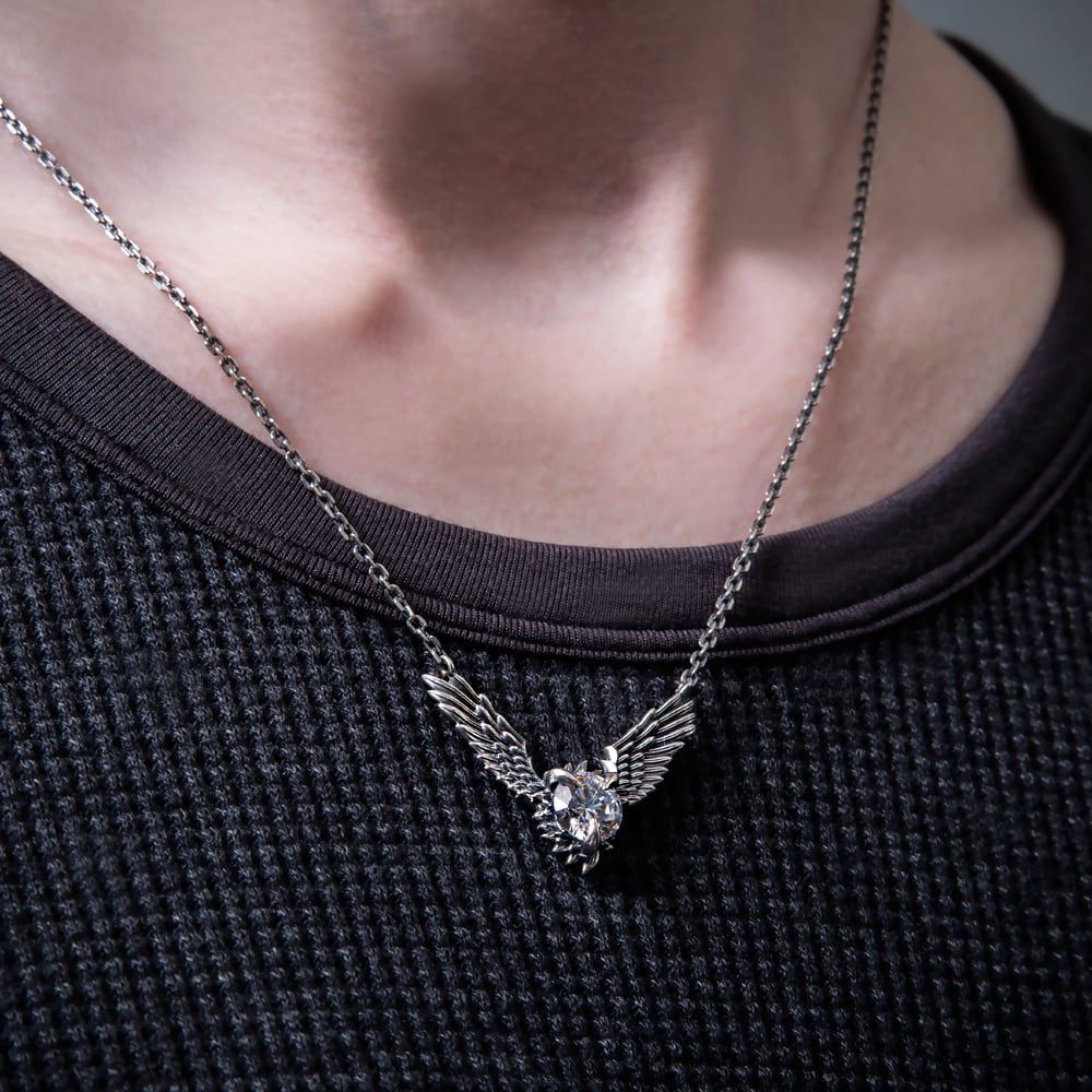 天使の翼をモチーフにした端正なフォルムに、クローがストーンを掴むようにセッティングされたユニークな一本です。羽根の一枚一枚まで緻密に彫り込まれた造形は、光と影を巧みに操り、まるで生きた翼が胸元に舞い降りたかのような存在感を放ちます。煌めくストーンは、クローの力強さと翼の優雅さを同時に映し出し、装う人の胸元に気品ある輝きを添えます。トップとチェーンを結ぶ吊り金具は、あえてシンプルに仕立てることで、デザインそのものの完成度を際立たせています。裏面にはブランドロゴと〈925〉の刻印が静かに光り、確かなクオリティの証を刻んでいます。アトリエ工房で熟練の職人が一点ずつ仕立て上げた本作は、職人技の結晶。ジュエリーのような存在感を宿しながらも、ファッションとしての軽やかさを併せ持つ、まさにアートピース。