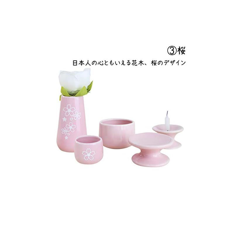 1.花立:Φ4.7cm×H8.2cm/2.水入れ:Φ4cm×H3.2cm 3.香炉:W6.2cm×H4.2cm 4.燭台:Φ5.1cm×H3.1cm/5.供物台:Φ6cm×H3.1cm