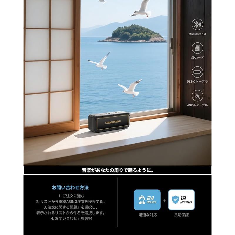 BOGASING G4 Bluetooth スピーカー ワイヤレス ブルートゥー ポータブル 50W迫力 大音量サウンド 重低音強化 24時間連続再生 DSP技術搭載 IPX7 防水 防塵 耐衝撃 アウトドア ぶるーとぅーすすぴーかー TWS対応 Bluetooth 5.3 USB-C AUX TFカード対応 お風呂 車載 主な特徴: ? 50W大音量サウンド ? IPX7 防水防塵? 24時間の連続再生 ? Ture Wireless Stereo (デュアルペアリング) ? ワイヤレス ポータブル - あらゆる機会に ? Bluetooth 5.3 - 超安定した Bluetooth 接続 ? 3 つの効果音 - 3D ステレオ / ボーカル / スーパーベース ? 4 つの再生モード - Bluetooth / TF カード / AUX-IN / USB-C ? 上質なシグネチャーサウンド ? 内蔵マイク - 携帯電話や iPhone などからの個人用ハンズフリー スピーカーフォン通話用