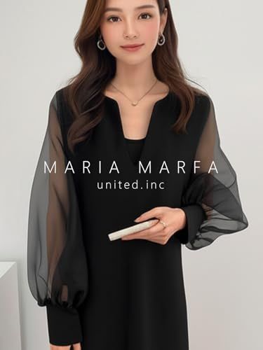 [MARIA MARFA] [マリアマーファ] 異素材 スキッパーネック ワンピース 透け感 シアー シフォンスリーブ ロングワンピ オフィス オフィスカジュアル おしゃれ お洒落 袖あり 春夏服 ドレッシー ロングスカート 薄手 美ライン vネック 謝恩会