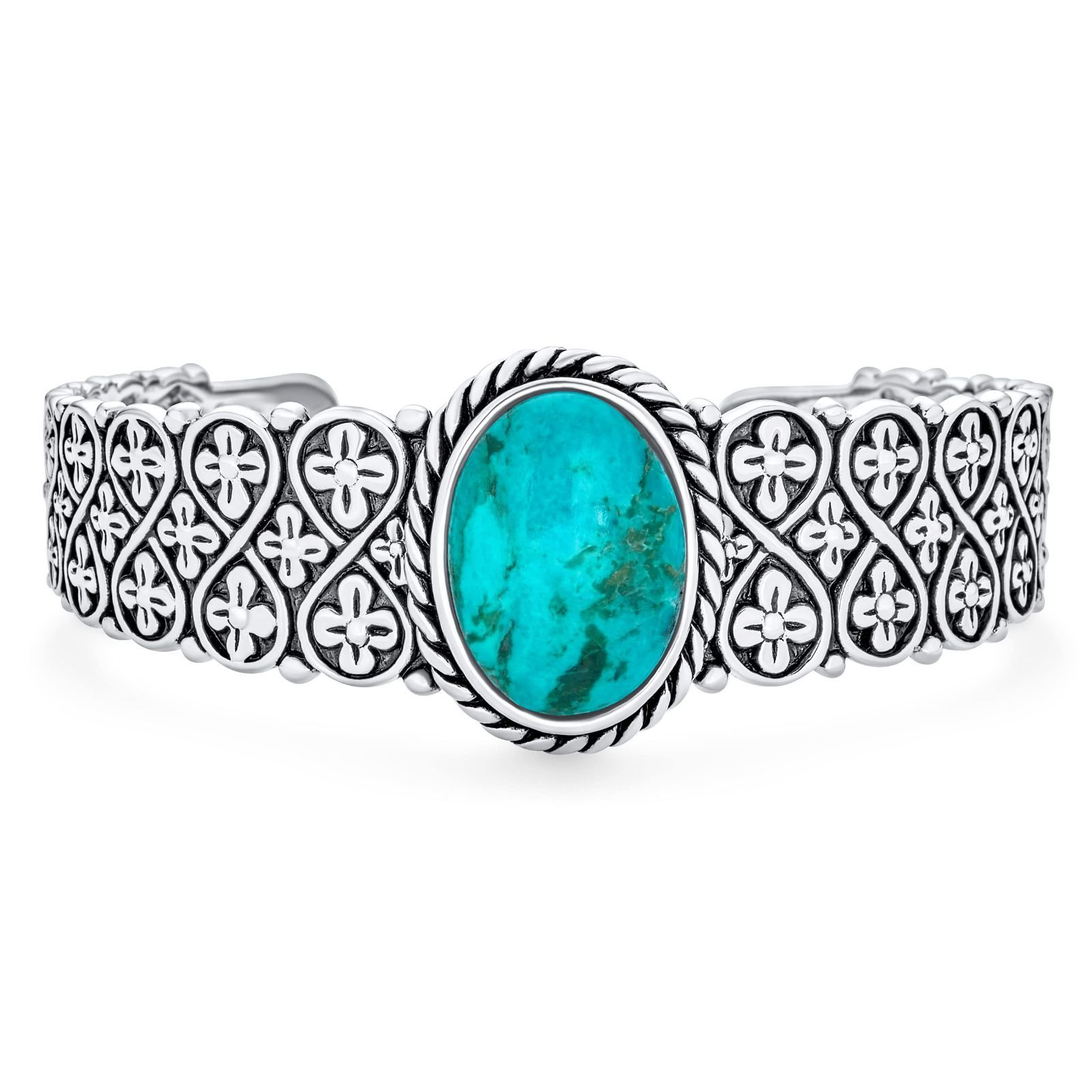 オーバル カボション ジェムストーン フローラ 南西部のスタイル クロス インフィニティ格子ターコイズ ワイド カフ ブレスレット女性用 .925スターリングシルバー