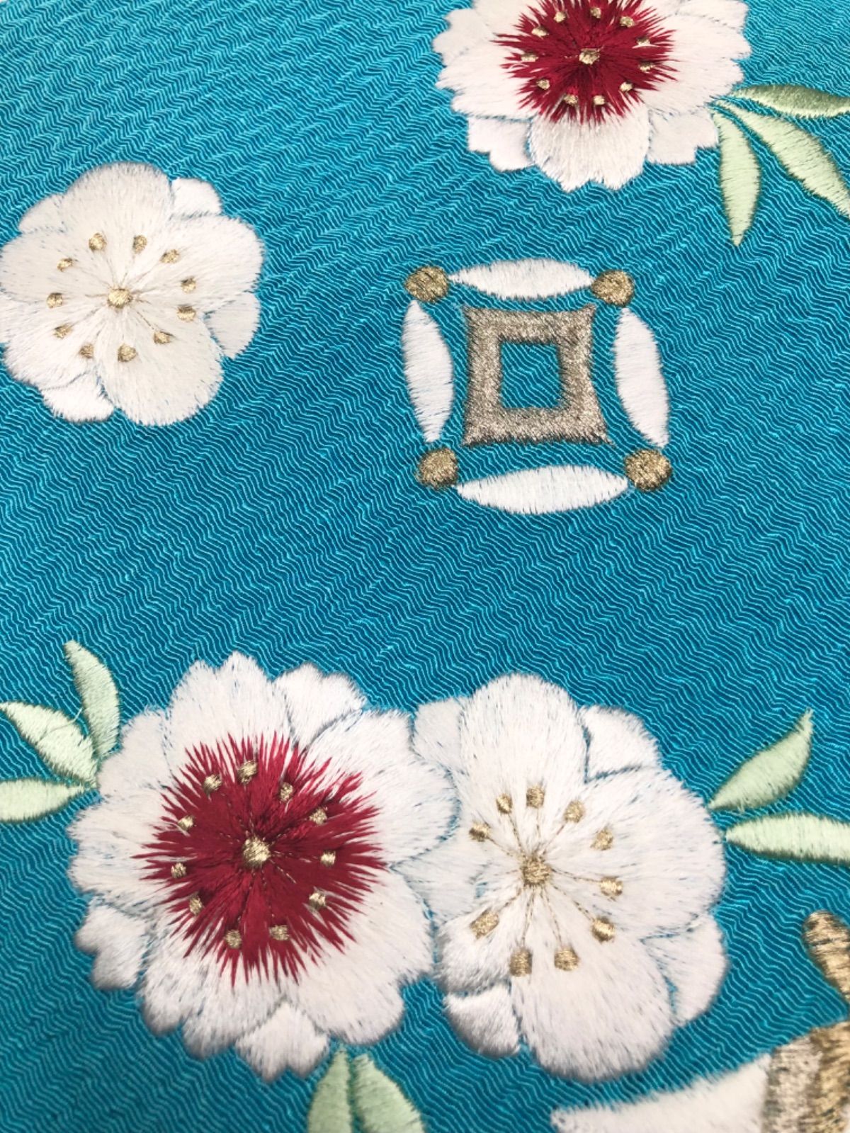 高級振袖用帯揚げ 水色 桜 宝尽くし 刺繡入り