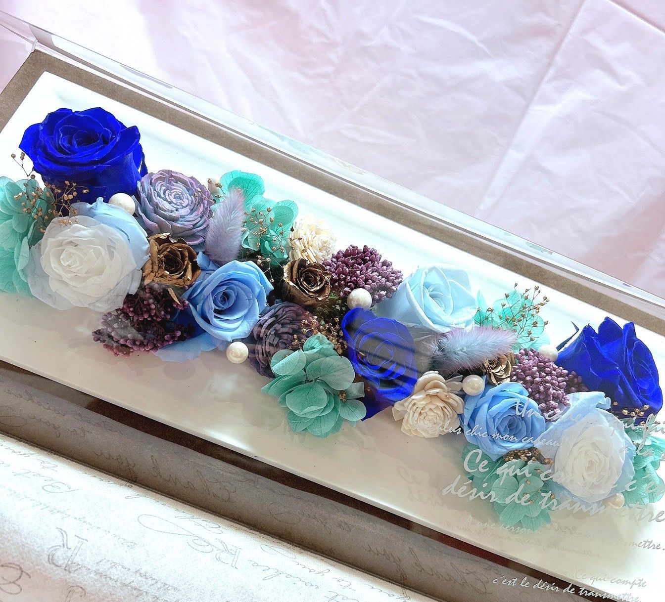 青の薔薇を中心に紫とゴールドのプリザーブドフラワーやドライフラワー、ソラフラワーを沢山使用し敷き詰めてフラワーアレンジメントを制作いたしました♪