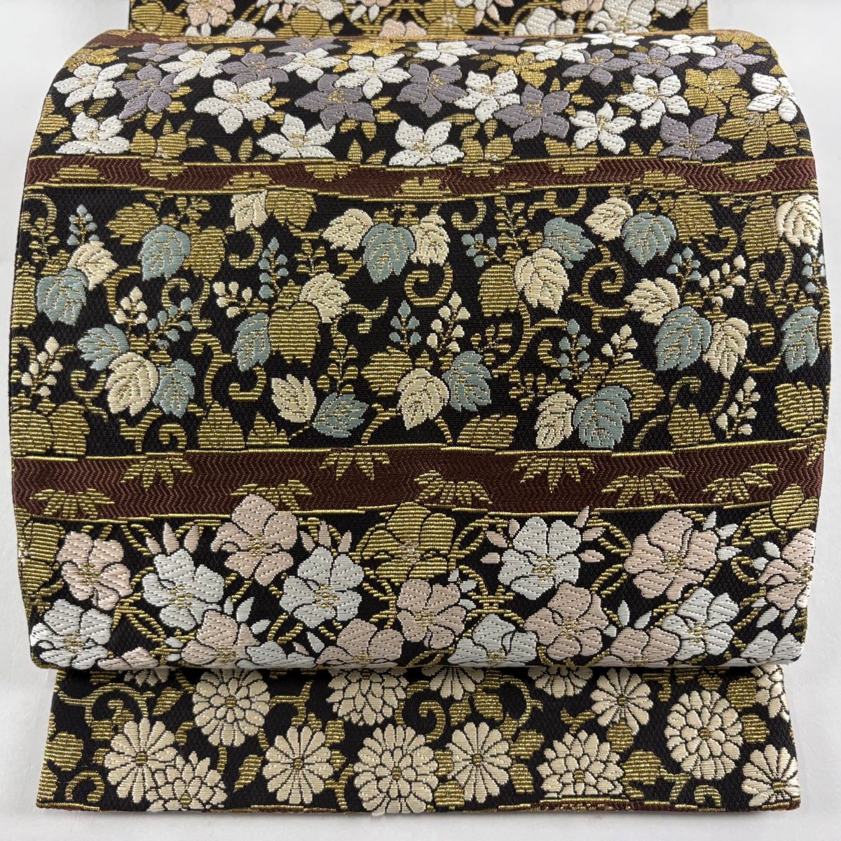 袋帯 花唐草 金糸 華山織 黒 全通 正絹