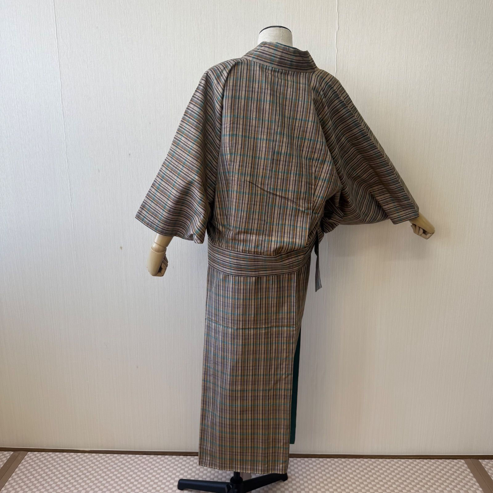 着物 二部式着物 正絹 紬 袷 二部式 格子 ベージュ リサイクル着物 z-556