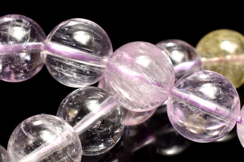クンツァイト特有の繊維状クラック内包を確認できる繊細な輝きを纏ったルースブレスレットです。