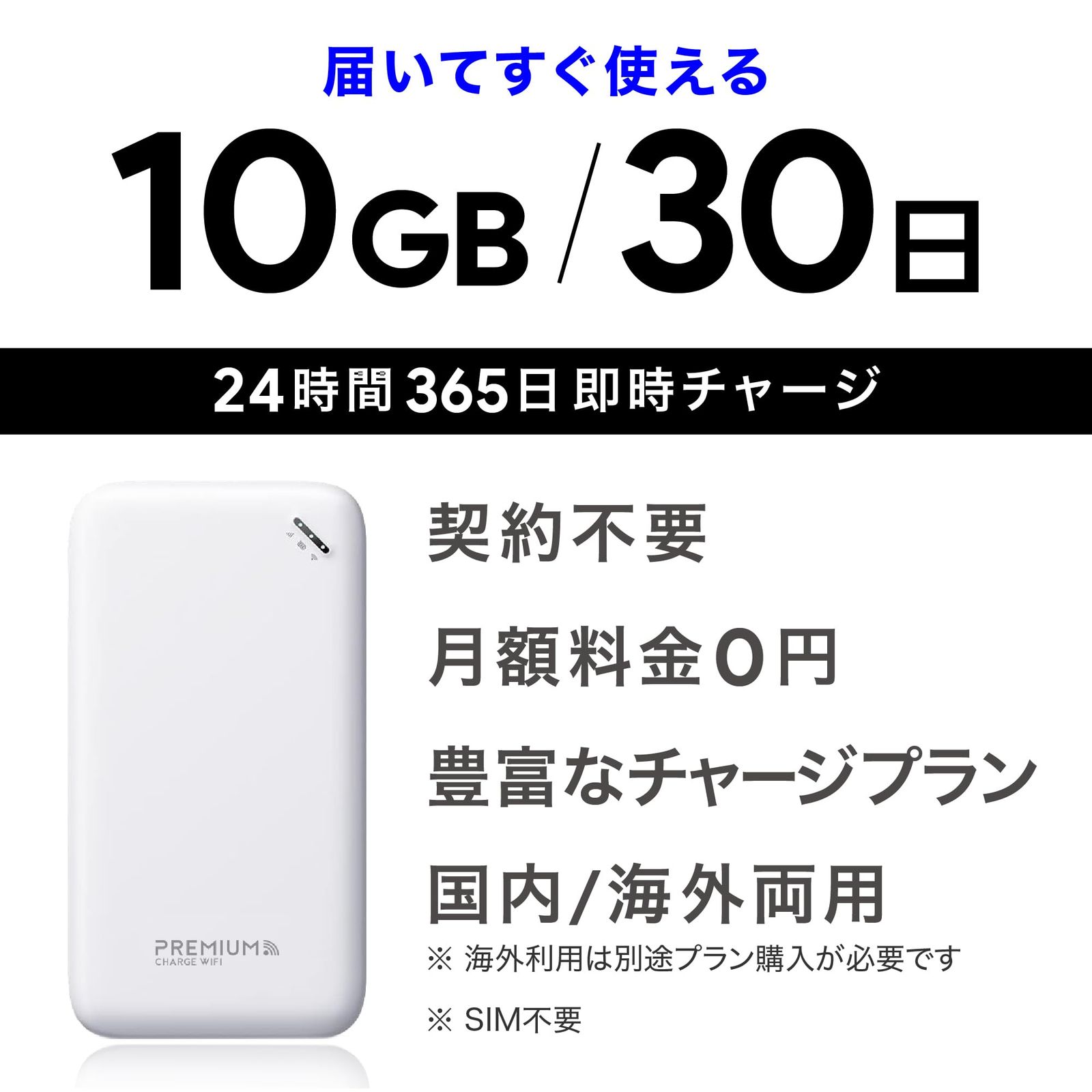 国内メーカー直営 [U20] 日本10GB/30日付 ポケット WiFi 【プレミアムチャージWiFi】 ギガ割引クーポン毎月付与 端末買い切り 契約・クレカ不要 利用分だけ都度チャージ 海外利用可能