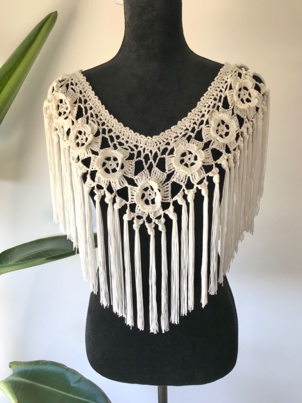 フラメンコ用手編みクロチェ、お花ポンポンフレコのマントンシージョ、オフホワイトです。