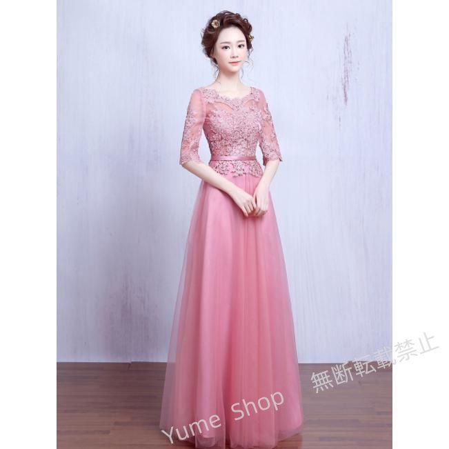 ♥ Aラインドレス パーティードレス カラードレス カクテルドレス 発表会 演奏会 ロングドレス フォーマルドレス イブニングドレス ピンク 半袖 Vネック ファスナー nhdw 114
