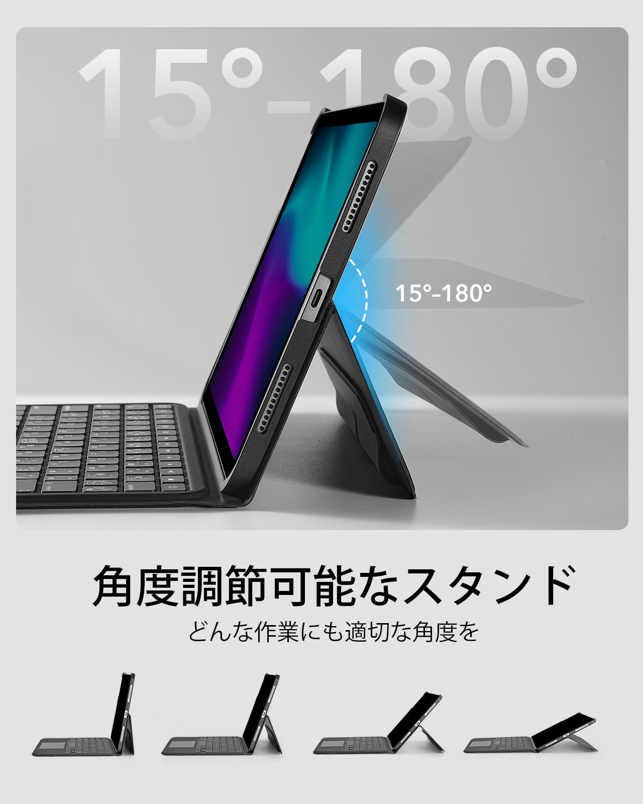 【角度調節可能なスタンド】:15°から180°まで、用途に合わせて角度調節が可能です。