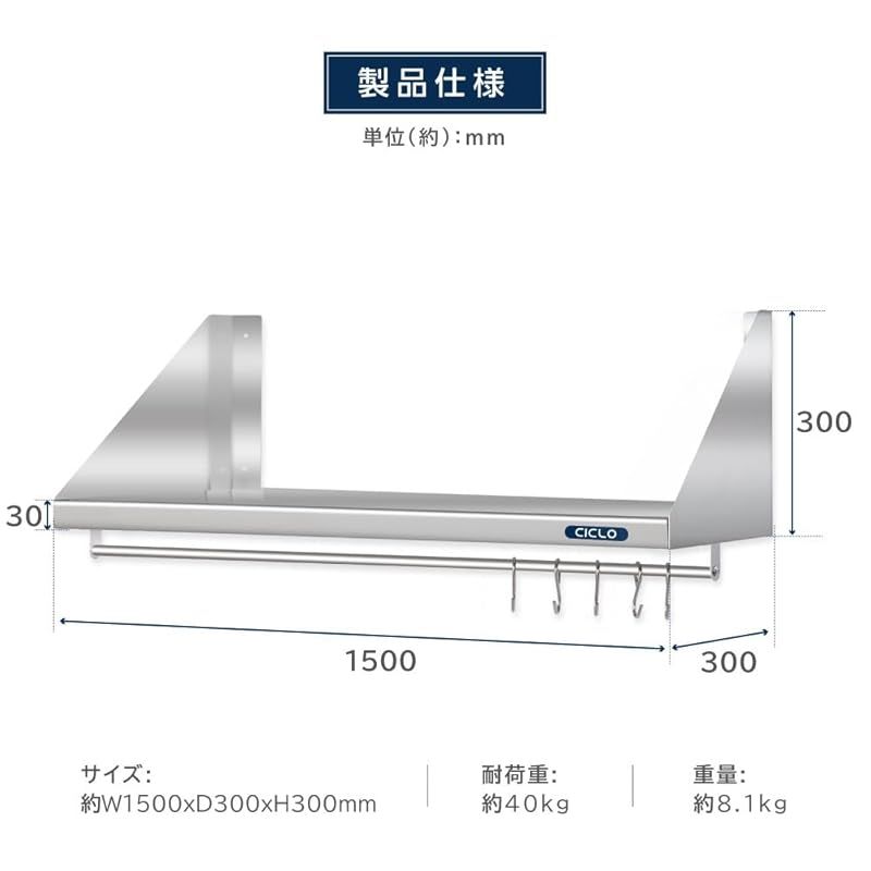 サインキングダム 造 ステンレス製 業務用 キッチン 平棚 パイプ付 フック5本付き キッチン収納 調味料ラック 吊り棚 つり棚 吊り平棚 ステンレス棚 壁面収納 収納棚 壁棚 ウォールラック 壁掛け 厨房 skk 002 1503 1